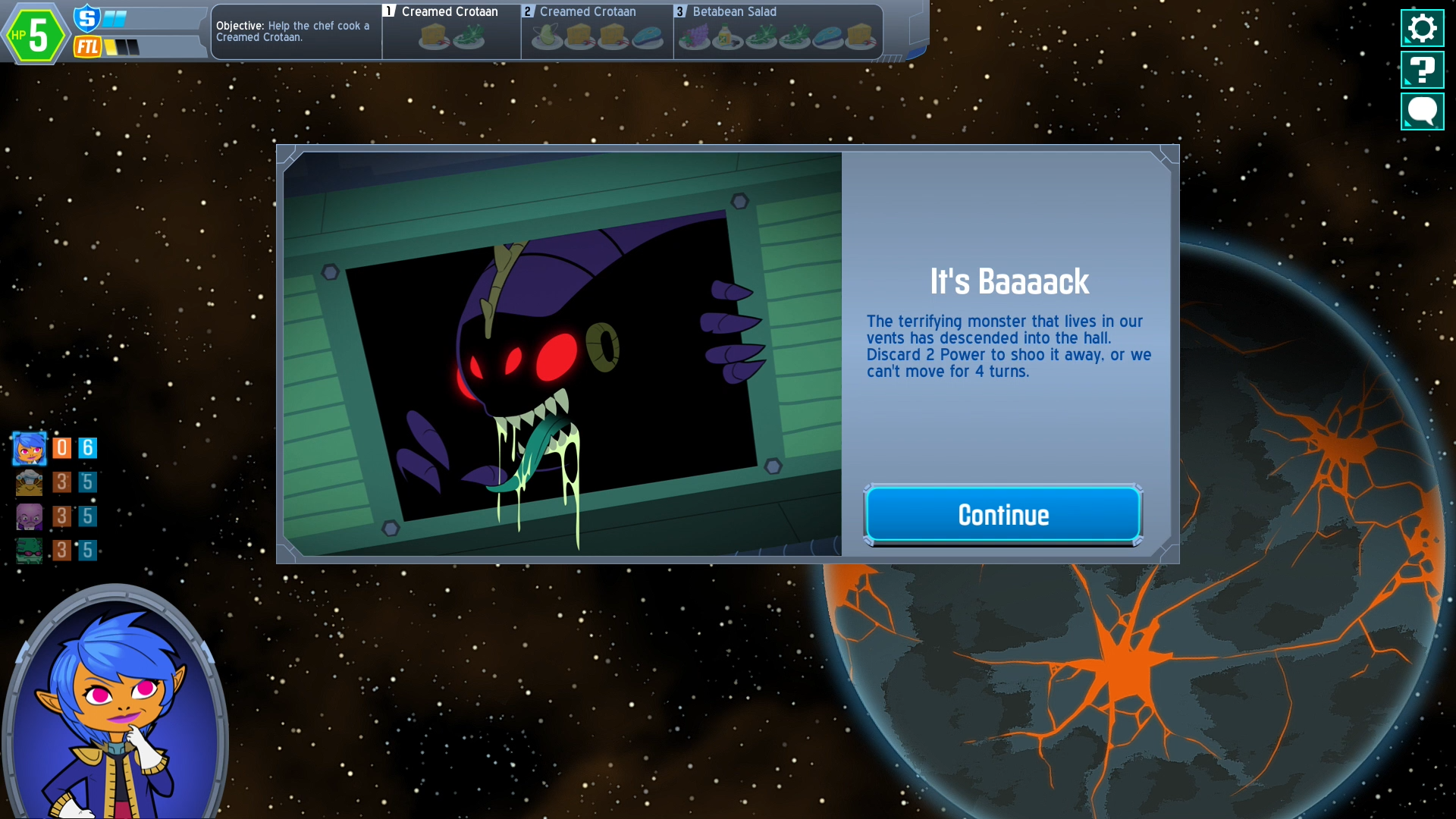 Everyone’s role plays differently. The Captain charts your team’s path across the galaxy: dodging danger, searching for exotic ingredients, and resupplying items for your store. The Chef coordinates with the rest of the crew to collect ingredients and cook recipes. The Scientist researches and unlocks more powerful abilities for your team, and the Engineer repairs and upgrades your ship.