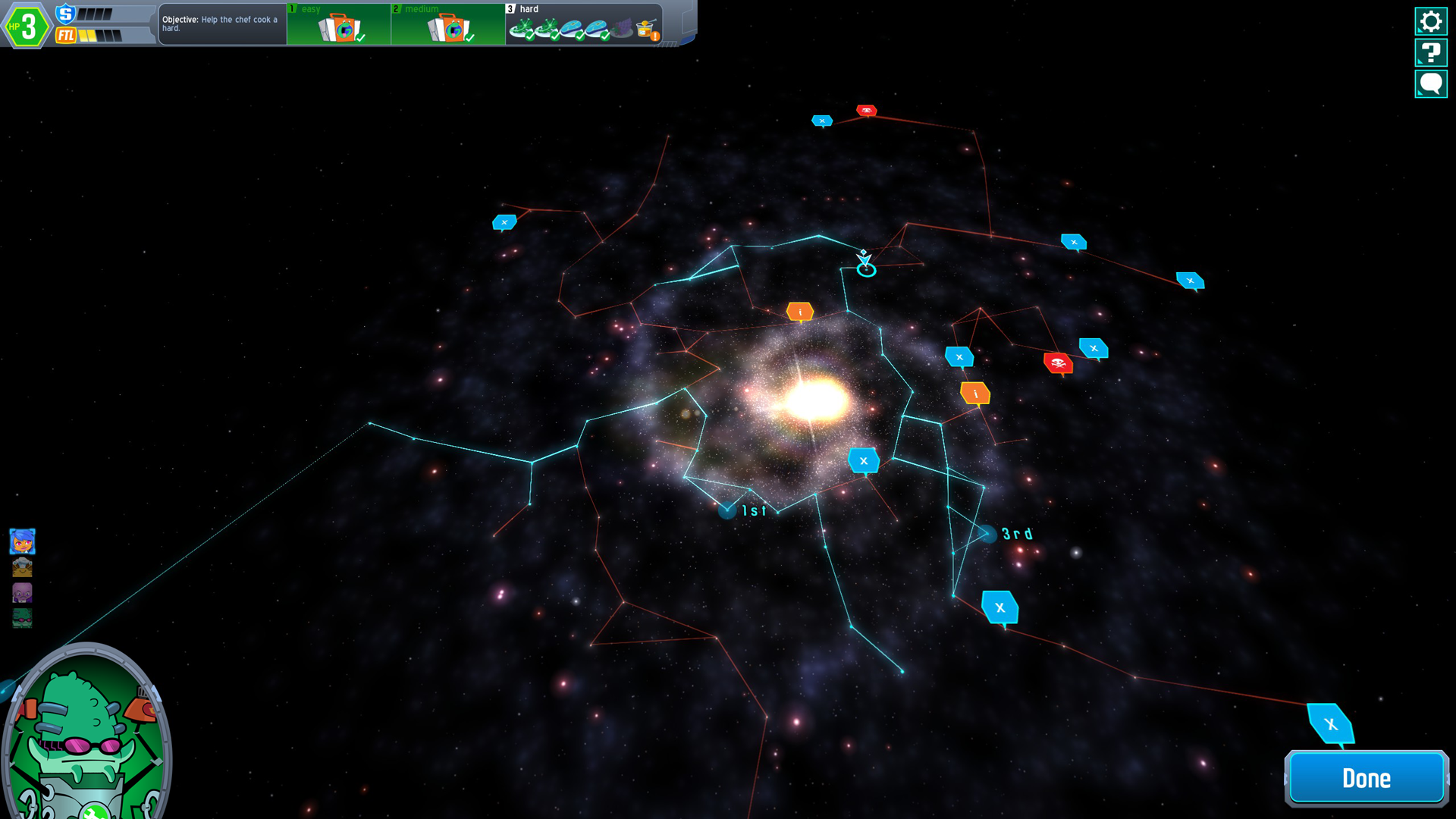 When you launch a game, our system procedurally generates a galaxy of 100 planets, hides all of the traps and ingredients among them, then determines what each planet looks like. Scramboron may be a tiny ringed gas planet one game, or a huge cybernetic planet the next!